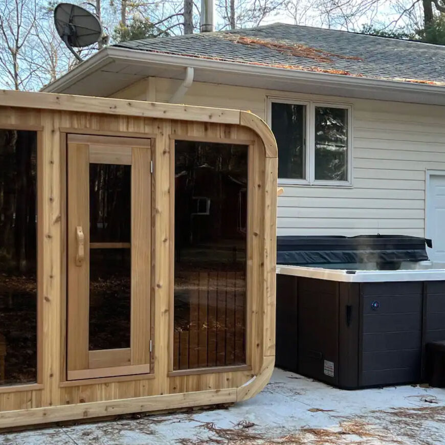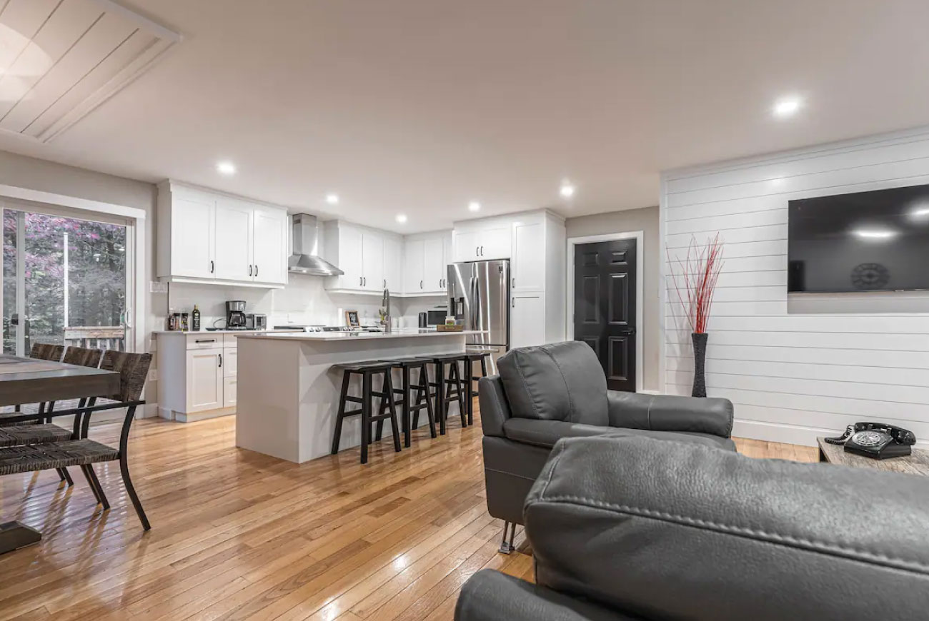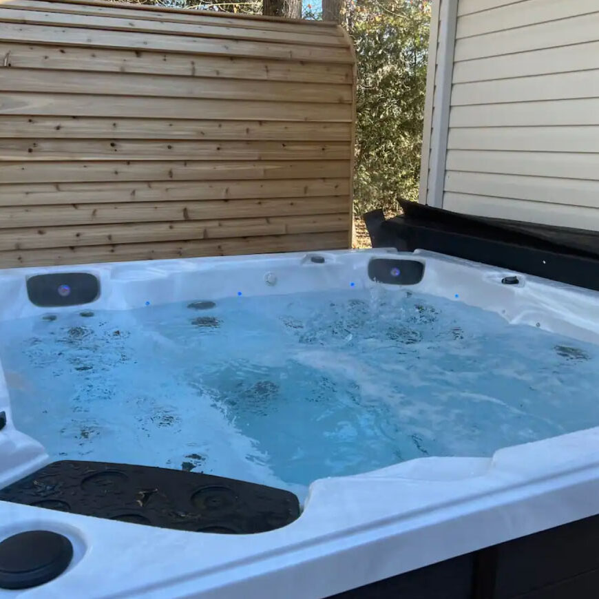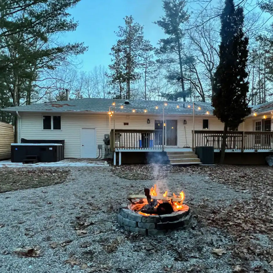 The cottage boasts a large backyard complete with a hot tub, sauna, a fully furnished deck, a BBQ, and a fire pit to enjoy your evening under the stars.